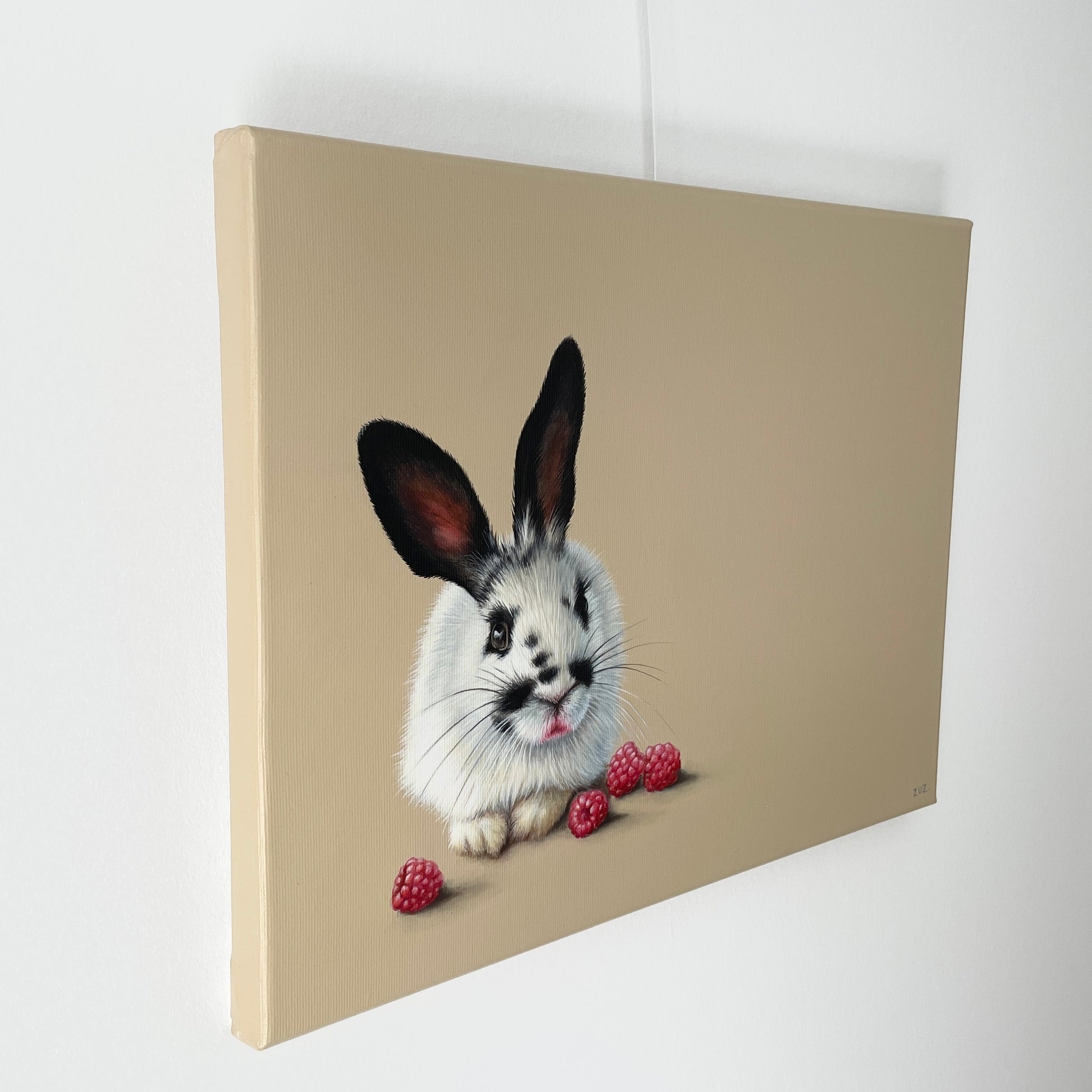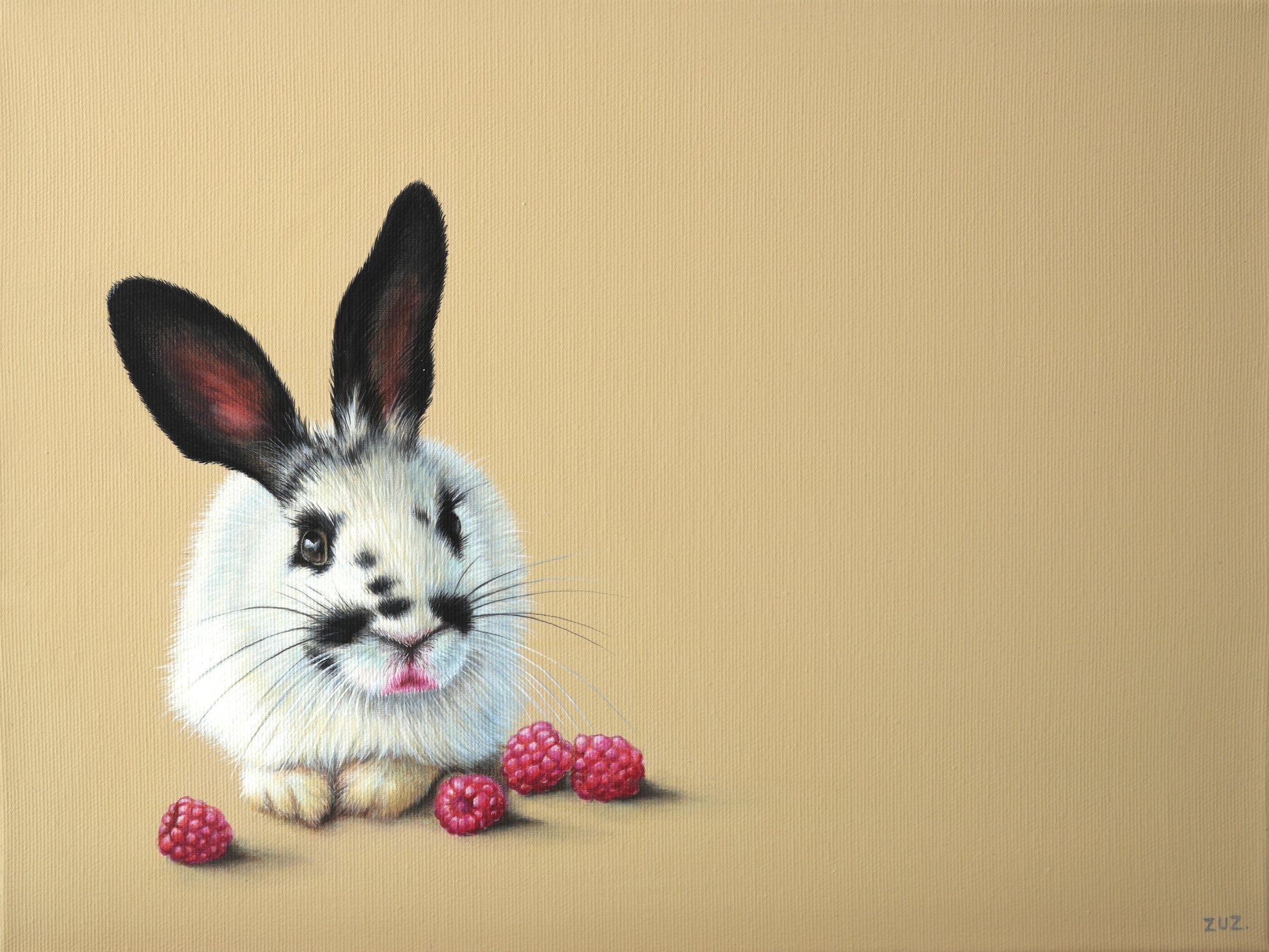 Ein Lippenstift trägt das kleine Kaninchen – oder ist es etwas anderes? Ah, schau mal, was bei ihm liegt – da hat wohl jemand die Himbeeren vernascht.